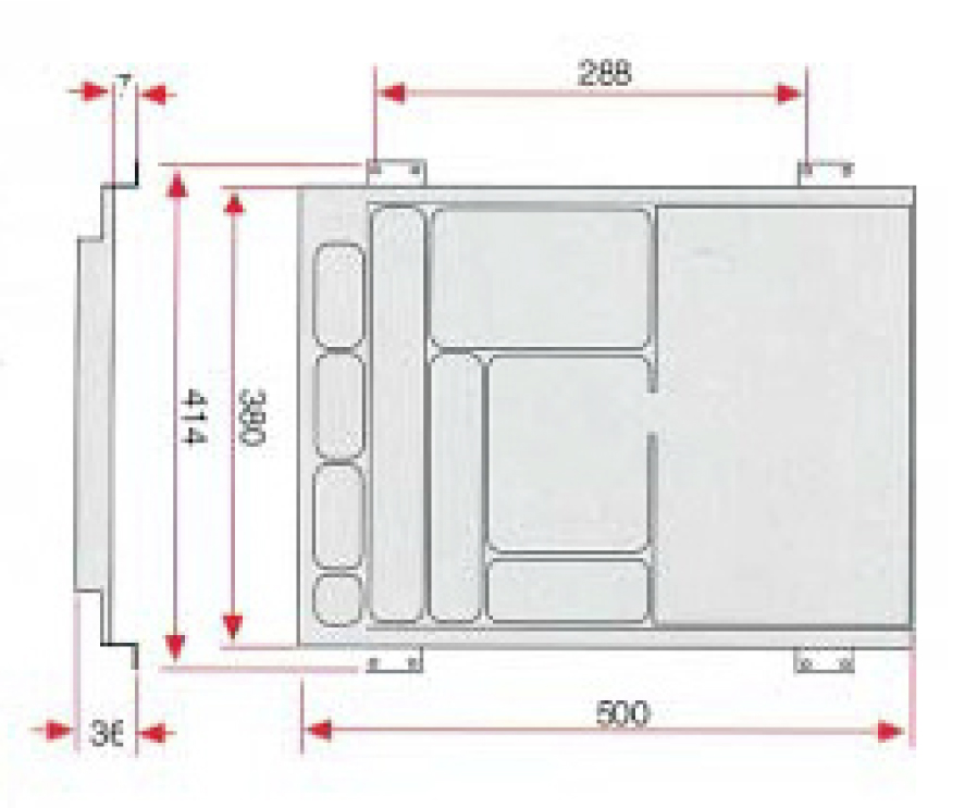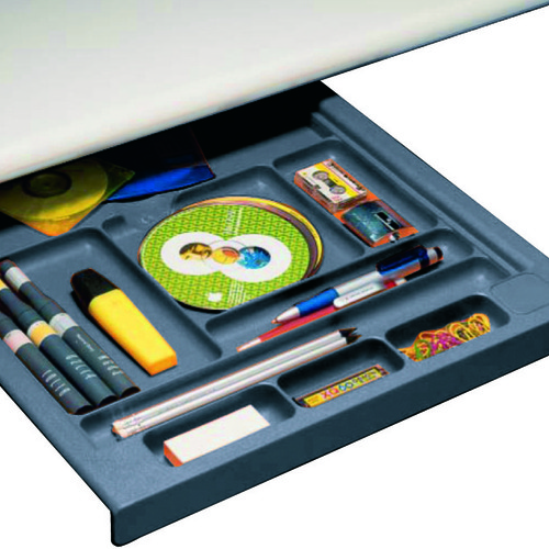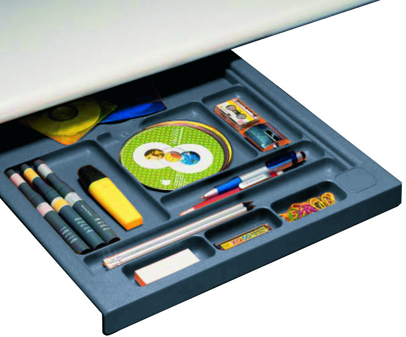 De pennenlade wordt onder het werkblad gemonteerd. De pennenlade is voorzien van metalen geleidingen.